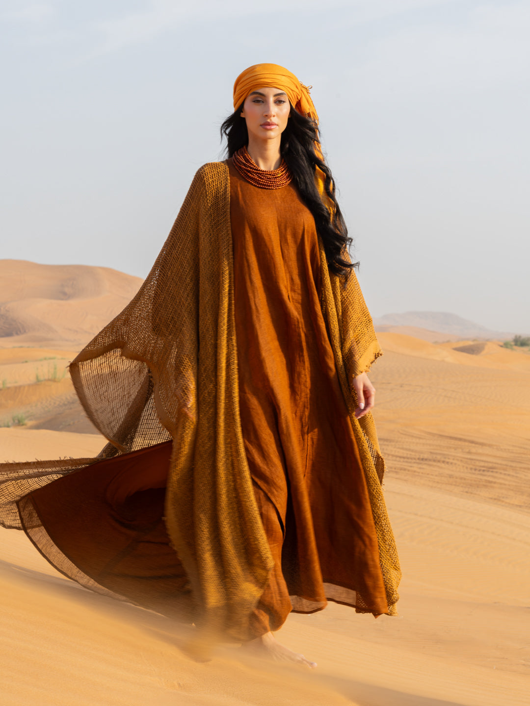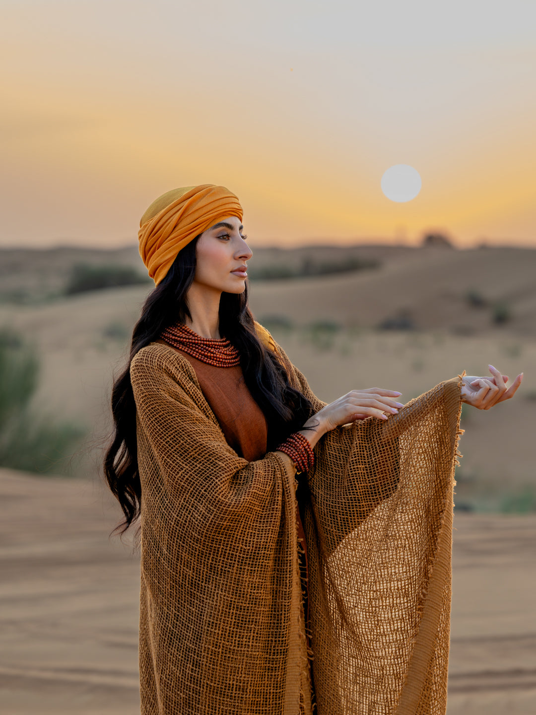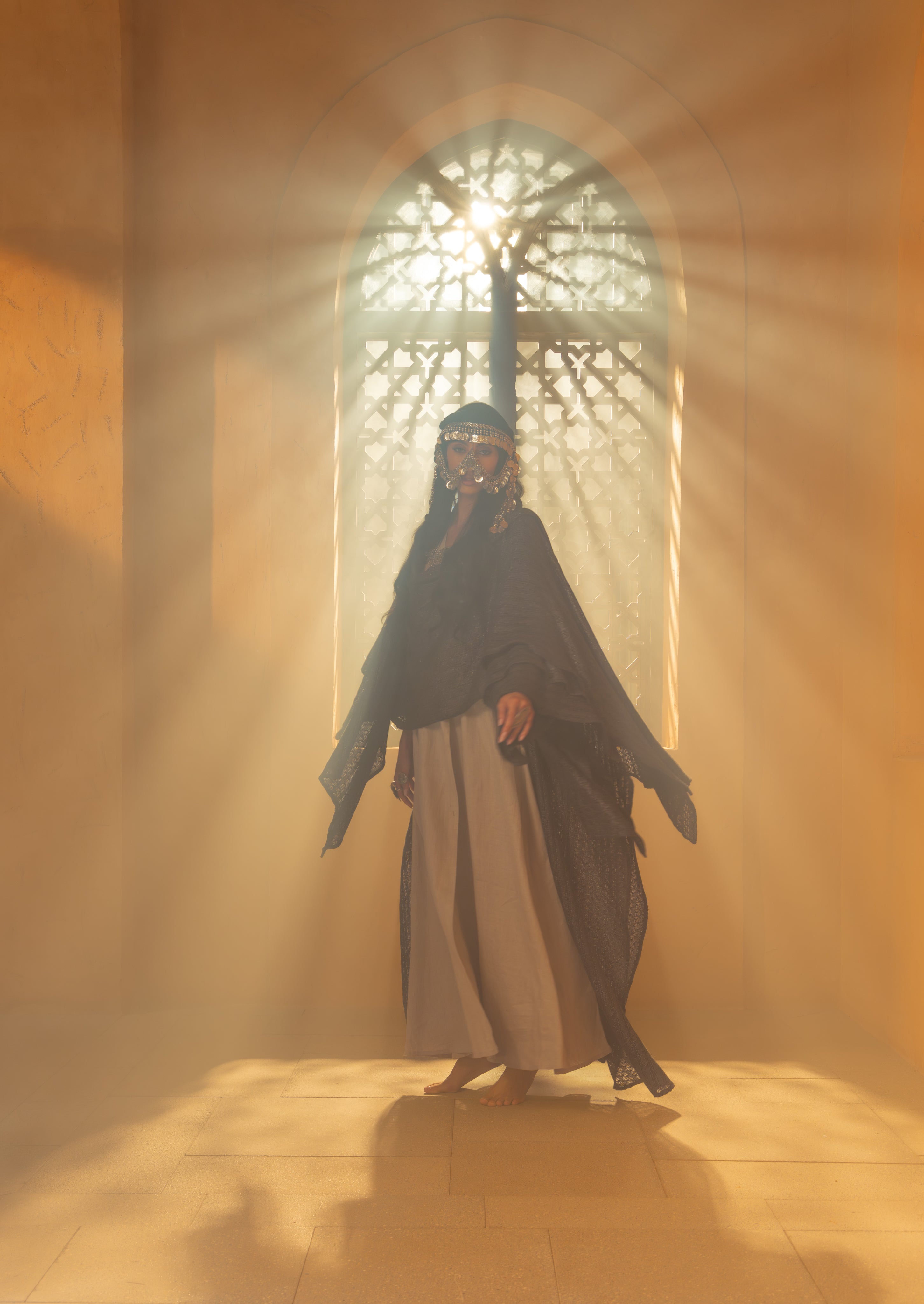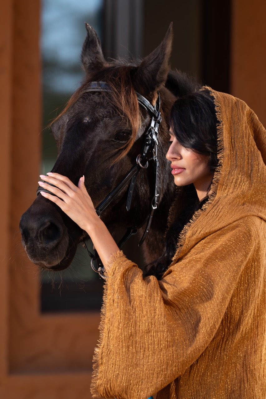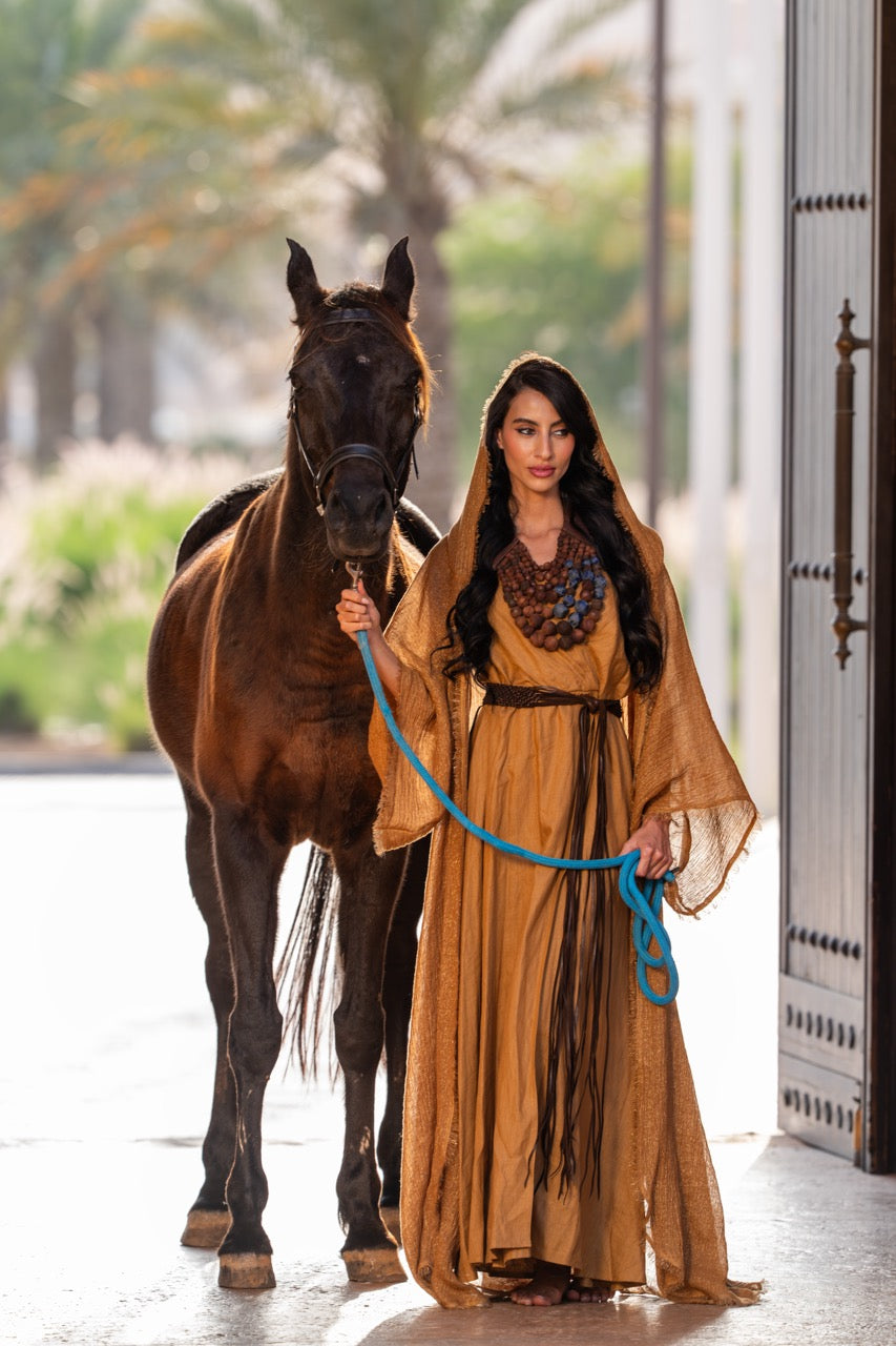 From the sands of forgotten kingdoms, she rises – the embodiment of ancient queens, whose memories echo through the ages, weaving gold and fire into the fabric of us.